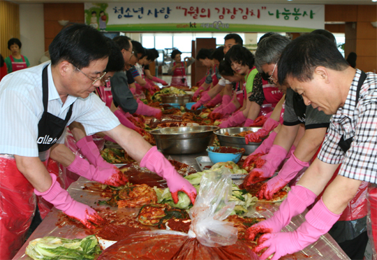 이날 kt 사랑의 봉사단 등 직원은 방학 기간 학교 급식을 받지 못하는 청소년이 지역아동센터에서 식사를 해결하는 것에 착안해 이날 배추 3000포기로 김치를 담가 103개 지역아동센터와 7개 중증장애인 시설에 10㎏ 들이 상자 120개를 나눠 전달했다.