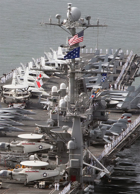 한미 연합훈련이 시작된 25일 미 7함대 소속 항공모함인 조지 워싱턴호(9만7천t급)가 미 해군의 최신예 전폭기와 조기경보기 등 60여대의 항공기를 탑재하고 부산항을 떠나 작전해역인 동해로 향하고 있다.