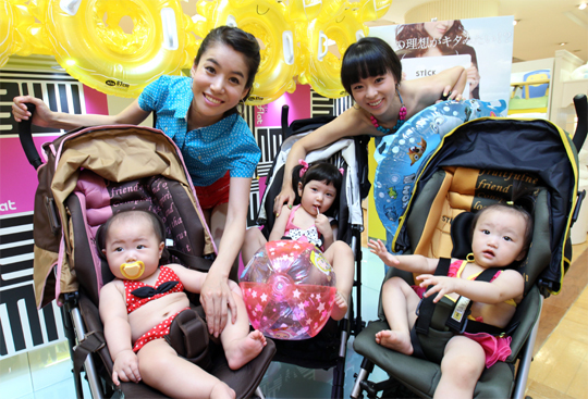 26일 서울 현대백화점 무역센터점에서 열린 아프리카 유모차 '스틱 플랫' 출시행사에서 비키니 수영복을 입은 아기들이 유모차를 썬베드 삼아 놀고 있다.