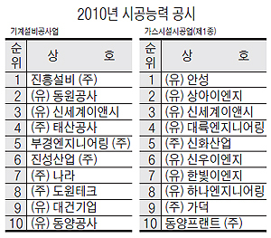 한편 가스시설시공업 부문에서는 (유)안성이 45억원으로 1위를 차지했고, 지난해 4위였던 (유)상아이앤지가 33억원으로 2위로 올라섰다. 3위는 시평액 30억 9800만원을 기록한 (유)신세계이앤시였다.