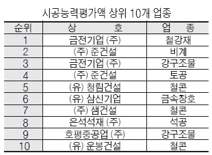 이어 296억여원으로 지난해 1위를 차지했던 (주)준건설이 9억여원이 줄어든 287억 9038만원으로 2위를, 금전기업(주)의 강구조물 업종이 273억 1184만원으로 3위를, (주)준건설 토목 업종이 272억 4451만원으로 4위에 각각 랭크됐다.