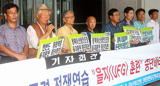 도내 시민사회단체와 진보정당 관계자 20여명이 16일 도청 광장에서 기자회견을 열고 을지(UFG)훈련 중단을 촉구하고 있다.
