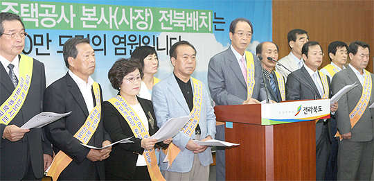16일 전북도청 브리핑룸에서 임병찬 LH본사유치추진위원장과 위원들이 LH본사 이전과 관련하여 정부의 결단을 촉구하는 기자회견을 하고 있다.