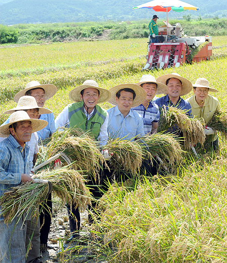 도내에서 처음으로 실시된 벼베기 행사가 18일 전주시 중인동에서 열려 송하진 사장과 참석자들이 벼베기를 하고 있다.
