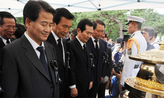 민주당 정세균 전 대표와 손학규 상임고문, 정동영 의원 등이 18일 오전 국립서울현충원에서 열린 김대중 전 대통령 서거 1주기 추도식에 참석, 묵념하고 있다.