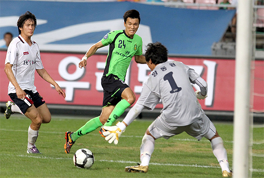 지난 22일 전주월드컵경기장에서 열린 쏘나타 K리그 2010 전북 현대와 대전 시티즌의 경기. 전북 강승조가 후반 인저리타임 때 3대2로 만드는 결승골을 넣고 있다. (desk@jjan.kr)
