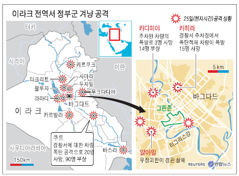 이라크 전역에서 25일(현지시각) 정부군을 겨냥한 공격이 잇따라 최소 64명이 숨지고 190명이 다쳤다.