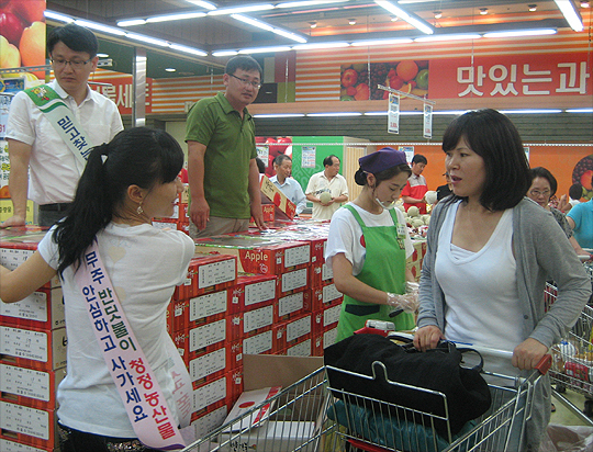 햇 출하된 홍로사과를 주 품목으로 이루어진 이번 연합판촉행사는 수도권 농협 대형매장을 활용, 판촉활동 전개를 통한 무주 반딧불사과 홍보 및 성수기 출하물량 확대를 통한 농가수취가격 제고를 목적으로 실시됐다.