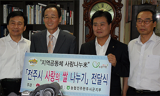 농협 전주완주시군지부(지부장 고득수)는 7일 '지역공동체 사랑 나누米'행사의 일환으로 쌀 100포(20kg)를 전주시에 전달했다.