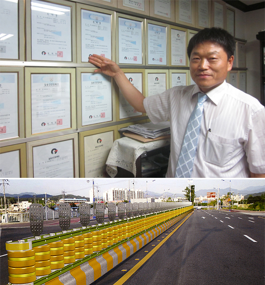 (위)남원시 용정동 ㈜금성산업 채종술 대표(50)가 자신의 사무실 벽면에 있는 특허증을 보면 관련 기술에 대해 설명하고 있다.(아래)(주)금성산업이 만드는 고속도로 중앙 안전 시설물. (desk@jjan.kr)