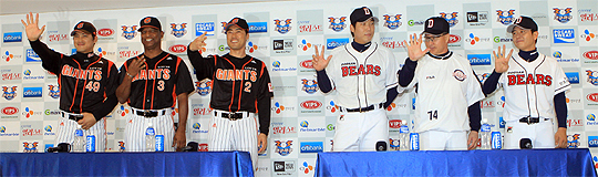 프로야구 준플레이오프를 하루 앞둔 28일 오후 잠실구장에서 열린 미디어데이행사에서 양팀 선수와 감독들이 준플레이오프가 몇차전에 끝날것인가를 묻는 질문에 손가락을 펴서 답하고 있다. 왼쪽부터 롯데 홍성흔, 로이스터 감독, 조성환, 두산 김현수, 김경문 감독, 손시헌.