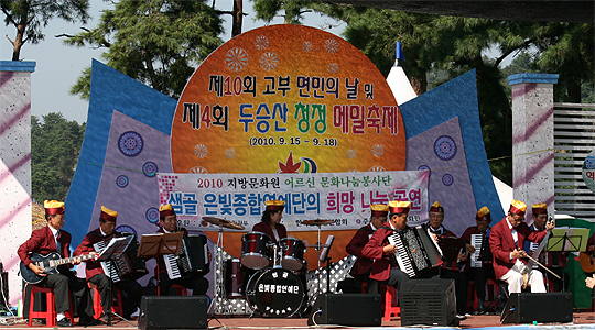 무대에 자리한 샘골 은빛종합연예단원들은 관객들의 귀에 익은 대중가요 '가거라 삼팔선'을 시작으로 10여곡의 경음악합주와 안완식씨의 톱 독주, 가수 허정심·김종선씨의 구수한 노래실력을 선보여 위안잔치를 관람하던 관객들이 노래를 따라부르고 무대앞까지 나와 춤을 추는등 열렬한 호응을 얻었다.