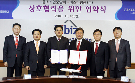 이날 협약을 통해 이스타항공은 모든 운항노선에서 각 항공기마다 10개의 좌석을 '중소기업인 전용좌석'으로 지정 운영하고, 특별 할인프로그램도 마련하기로 했다.