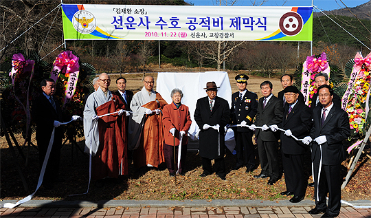 고창경찰서(서장 류선문)와 조계종 24교구 선운사(주지 법만) 주최로 김재환 소장을 기리는 '선운사 수호 공적비 제막식'이 22일 11시 선운사 일주문에서 열렸다.