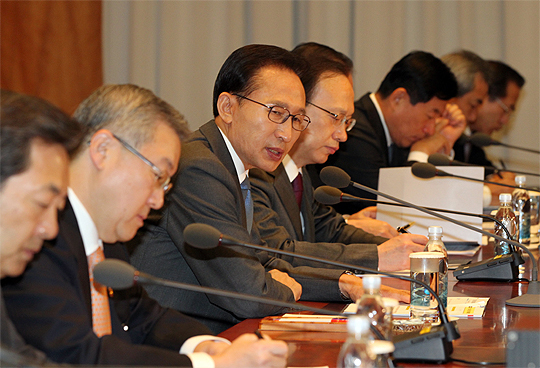 이명박 대통령이 25일 오전 청와대에서 긴급 안보·경제 점검회의를 열어 북한의 연평도 포격 도발에 따른 후속 대책을 논의하고 있다. (desk@jjan.kr)