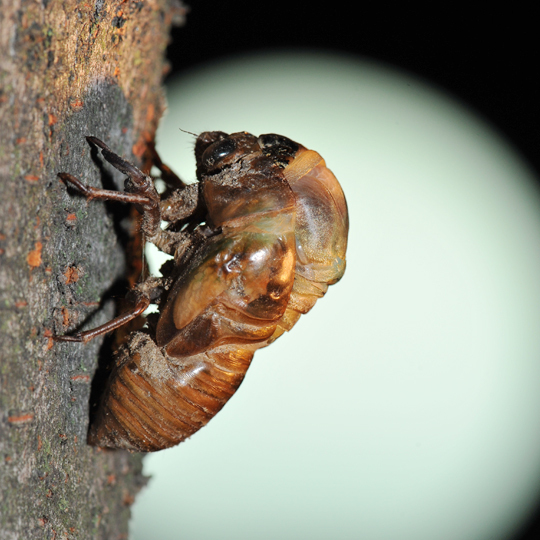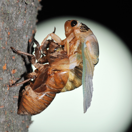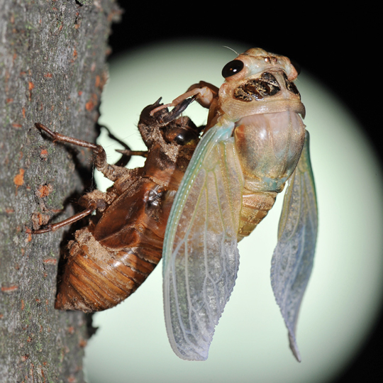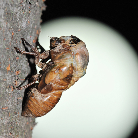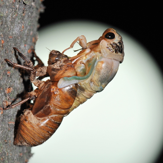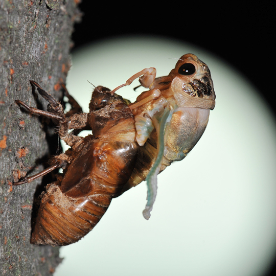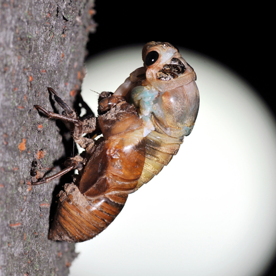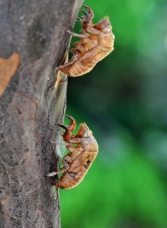 땅 위로 나온 매미의 성충이 느티나무에 올라가 우화(羽化-허물을 벗는 것)하는 모습은 신비롭다. 매미 성충의 등아래 가운데 쪽에서 푸른 빛이 보이더니 곧바로 우화를 시작한다. 머리에서 등 위쪽으로 허물이 갈라지며 그 틈새로 매미 머리가 보인다.