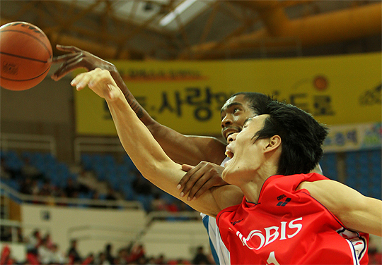 5일 울산동천체육관에서 열린 프로농구 울산 모비스와 전주 KCC의 경기, 전주 KCC다니엘스(뒤)와 울산 모비스 류종현이 리바운드 볼을 다투고 있다.