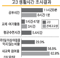 고등학교 3학년 학생들의 주중 평균 수면시간은5.4시간이며 하루 11시간3분 동안 공부한 것으로 나타났다.