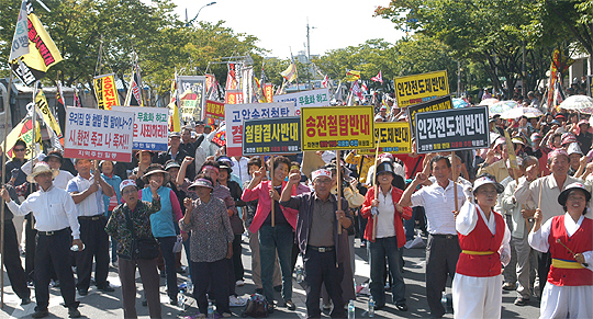 군산~새만금 송전선로 철탑 설치를 반대하는 주민들이 지난 9월 27일 군산시청 앞에서 집회를 열고 있는 모습. (desk@jjan.kr)