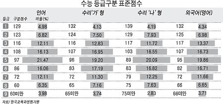 즉 올해 수능에서는 수리 가형이 가장 어려웠기 때문에 이 과목의 표준점수 최고점은 작년과 비교해 11점이나 상승했다.