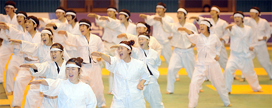 2010 전북일보배 태권도대회에서 우석대학교 태권도학과 사범단들의 동학농민혁명 주제로 태권도 공연을 하고 있다. 이강민(lgm19740@jjan.kr)