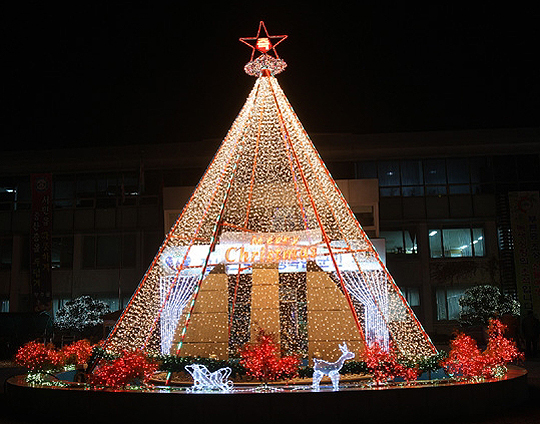 무주군이 군청앞 광장에 높이 9m, 둘레 24m의 철재 빔 원추형 대형트리를 설치하고 14일 점등식을 가졌다.
