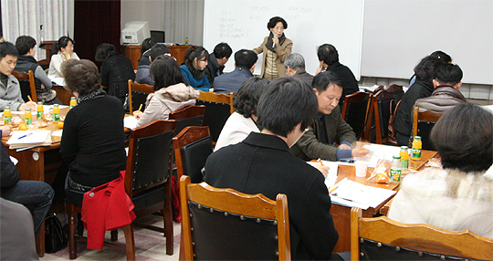 1부 수업에서 교사로 나선 백인숙 교육장은 중학교 1학년 사회과의'열대 기후지역과 한대 기후지역의 차이'라는 주제를 통해 학생들의(교사) 발표훈련을 주관했다.