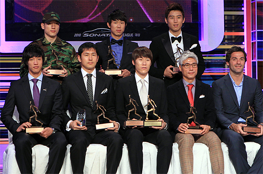 ◇2010 쏘나타 K-리그 대상 부문별 수상자△최우수선수상(MVP)= 김은중(제주)△신인선수상= 윤빛가람(경남)△베스트11= 김용대(서울.GK) 최효진(서울) 아디(서울) 사샤(성남) 홍정호(제주.이상 DF) 구자철(제주) 몰리나(성남) 에닝요(전북) 윤빛가람(경남.이상 MF) 김은중(제주) 데얀(서울.이상 FW)△감독상= 박경훈(제주)△득점상= 유병수(인천.28경기 22득점)△도움상= 구자철(제주.26경기 11도움)△특별상= 김병지(경남) 김용대(서울) 백민철(대구) 유병섭 안상기(이상 심판)△최우수심판상= 최명용(주심) 정해상(부심)△페어플레이팀= 강원FC △베스트팀= FC서울△축구팬이 뽑은 팬타스틱 플레이어= 구자철(제주)△올해의 유소년클럽= 수원 삼성(매탄고)hosu1@yna.co.kr