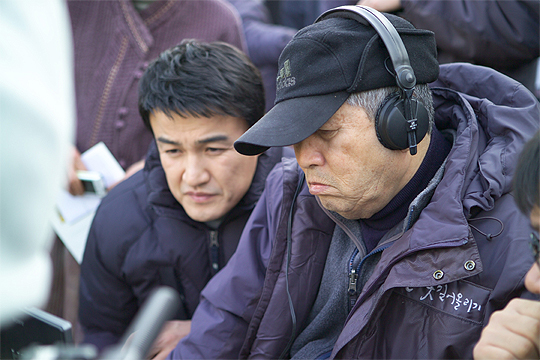 전주에서 촬영되고 있는 영화 '달빛 길어울리기' 에서 임권택 감독과 주연배우 박중훈씨가 작품을 모니터링하고 있다. (desk@jjan.kr)