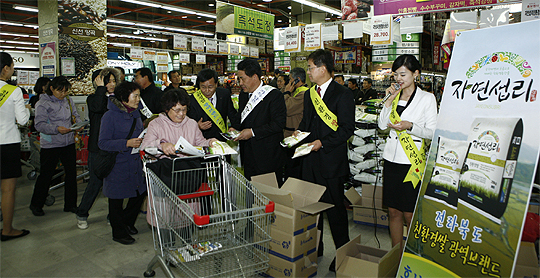 23일 서울 창동 농협 하나로마트에서 전북도와 전북농협 등 관계자들이 친환경쌀 광역브랜드인 '자연섭리' 출시 행사를 벌이며 소비자들에게 홍보하고 있다. (desk@jjan.kr)