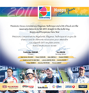 국제양궁연맹(FITA)은 23일 집행부 이름으로 세계 양궁팬들에게 보낸 연하장에 윤옥희와 브래디 앨리슨(미국.이상 리커브), 세르지오 파그니(이탈리아), 알비나 로기노바(러시아.이상 컴파운드)의 사진을 새겼다.