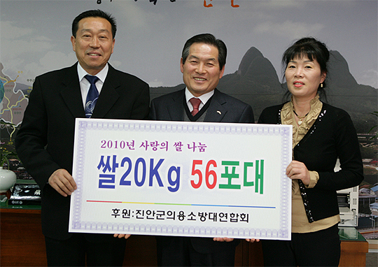 진안군 의용소방대연합회(회장 구훈회)는 관내 생활이 어려운 불우이웃 세대에 20kg들이 백미 56포를 전달했다.