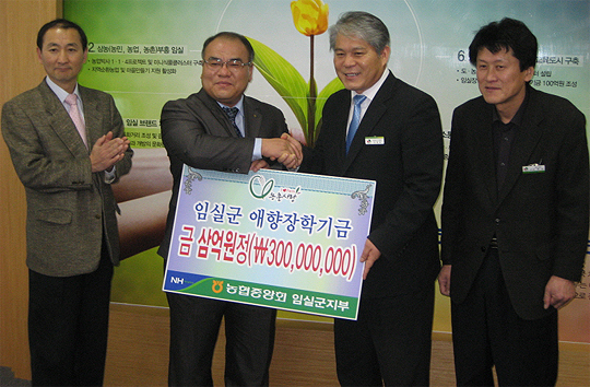 농협임실군지부(지부장 정형모)는 29일 강완묵 임실군수를 방문하고 지역내 인재양성에 힘써 달라며 애향장학기금 3억원을 기탁했다.