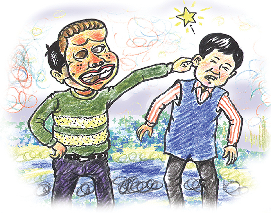 간신히 둘을 떼어놓고 난 후 양쪽 다 귓불을 한껏 잡아 당겼지. 그리고 벌름코 머리를 한 대 더 쥐어박았어. 벌름코 눈에서 불꽃이 '파박'하고 튀었어. 나는 아무렇지도 않게 벌름코를 향해 씩하고 웃어주었어. 벌름코가 뭐라고 하려다 입을 꾹 다무는 게 보였어. 아마 이 상황을 어떻게 할 수 없었겠지.