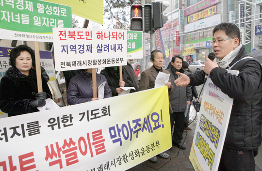 전북인권선교협의회와 전북목회자 정의평화협의회는 지난 30일 전주 서신동 아마트 옆에서 천막농성중인 조지훈 전주시의장과 함께 영업시간 2시간 단축과 월3회 휴업을 요구하는 집회를 가졌다.