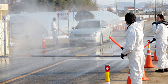 지난달 29일 익산의 한 농장에서 발생한 AI가 고병원성으로 최종 판명됨에 따라 익산 망성면 신리마을 앞에서 공무원과 주민들이 차량 방역을 실시하고 있다.