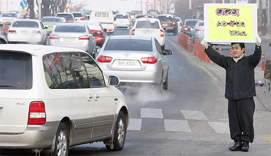 전주시의회 이도영 의원이 전주 평화동 사거리에서 신묘년 첫 출근 차량에게 새해 복 많이 받으라는 인사를 하고 있다.