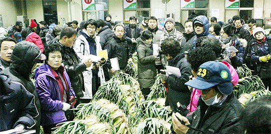 3일 새벽 전주 송천동 농수산도매시장에서 열린 초매식에 참가한 중도매인들과 농산물 관계자들이 바쁜 몸놀림으로 새해 첫 경매를 진행하고 있다.
