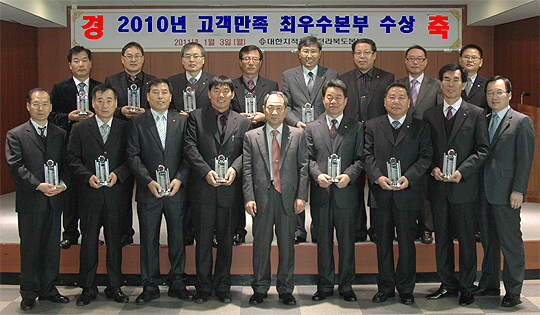 대한지적공사 전북본부(본부장 안종호)가 2010년 공공기관 고객만족도 조사에서 전국 12개 본부 중 최우수본부상을 수상했다.