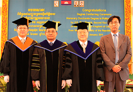 이날 명예정치학 박사를 수여받은 뗍 응온(Tep Ngorn) 상원 부의장은 한국과 캄보디아 두 나라간 선린외교와 관계 개선을 비롯해 국제협력에 공헌한 점이 인정돼 학위를 받았다.