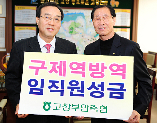 고창부안축협(조합장 김사중)은 전국적으로 확산되고 있는 구제역의 확산 방지를 위해 고생하시는 분들을 위해 써 달라며 성금 100만원을 21일 고창군에 전달했다. 전달된 성금은 축협 전 직원이 급여의 일정부분을 기부한 금액이다.