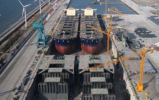 특히 세계 최대를 자랑하고 있는 길이 700m, 폭 115m, 깊이 18m의 도크에서는 1650톤을 들어 올릴 수 있는 'ㄷ'자 모형의 대형 기중기인 골리앗크레인 1기가 18만톤급 벌크선 2척을 건조키 위해 대형 블럭을 들어 올리고 있었다.