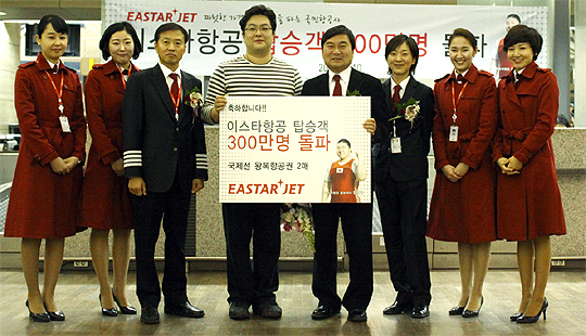 이날 행운의 300만 번째 고객은 삿포로(신치토세공항)로 가는 ZE6021편에 탑승한 진대호씨(37·서울시)가 차지했다.