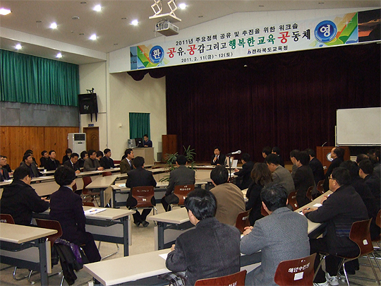 전북교육청과 직속기관, 지역교육지원청 간부 100여명은 지난 11일과 12일 이틀동안 부안에 있는 전북해양수련원에서 워크숍을 갖고 2011 전북교육 주요업무와 각 실과별 특색사업, 전북교육현안 등에 대한 설명회와 분임토의를 거친 뒤 교육감과의 대화의 시간을 가졌다.