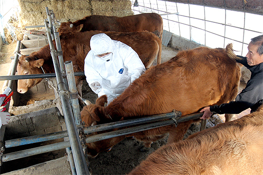 지난 1월 10일 정읍시 접종반원들이 10일 오전 신태인읍 화호리의 한 축사에서 소에게 구제역 예방접종을 실시하고 있다. (desk@jjan.kr)
