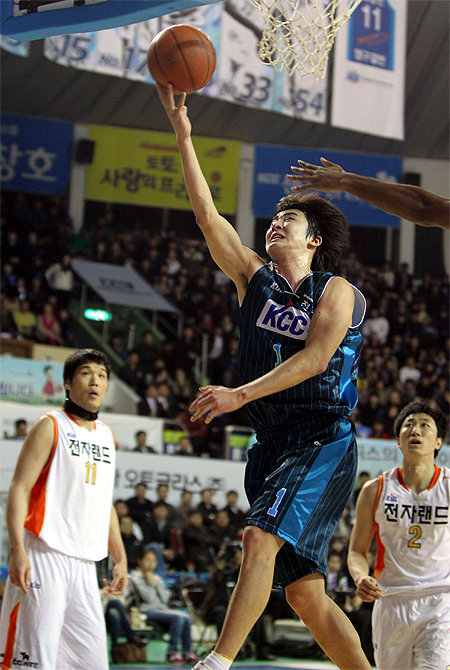 17일 전북 전주실내체육관에서 열린 프로농구 전주 KCC와 인천 전자랜드의 경기에서 KCC 강병현이 레이업슛을 하고 있다.