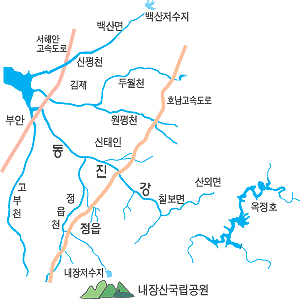 동진강은 강 유역에 거미줄처럼 얽힌 인공 도수(導水)시설이 지천의 역할을 해내고 있다는 점이 특징이다.