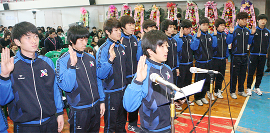 21일 전주기전대학 강당에서 열린 축구단 창단식에 선수들이 선수대표 선서를 하고 있다. 추성수(chss78@jjan.kr)
