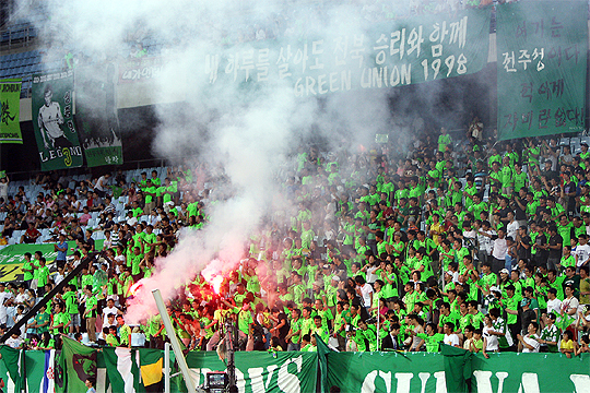 프로축구 전북현대모터스축구단의 팬들이 응원하는 모습. (desk@jjan.kr)