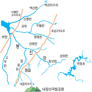 정읍 이평면과 신태인읍의 경계지점에서 강 본류에 합류하는 정읍천은 국립공원 내장산 북측 사면(斜面)의 물길을 모아놓은 3개의 저수지를 주요 수원(水源)으로 하고 있다. 입암저수지와 용산저수지, 그리고 내장산 국립공원 안에 축조된 내장저수지다.